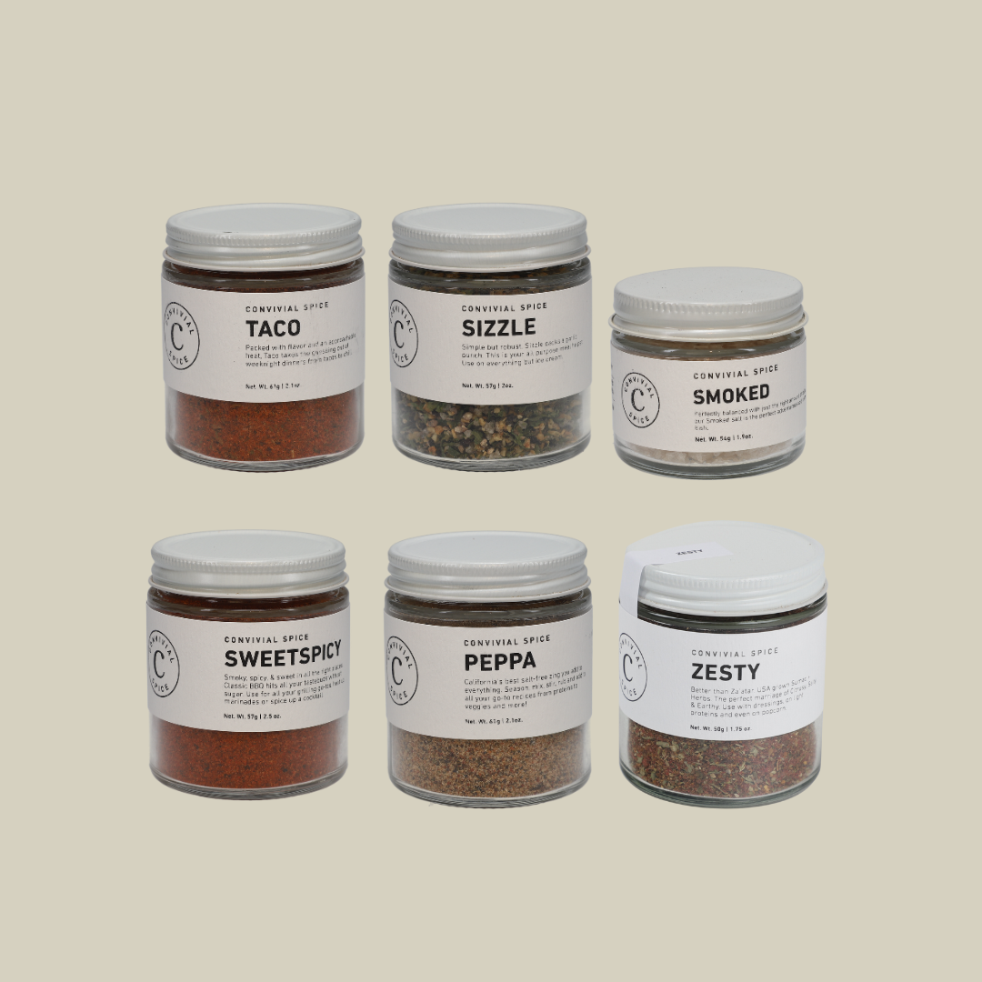 6 of our most popular spices in one perfect spice bundle. Sizzle, Peppa, SweetSpicy, Taco, Zesty and Smoked salt. Makes a great housewarming gift. (Please Note. Size variations applies to Sizzle only).